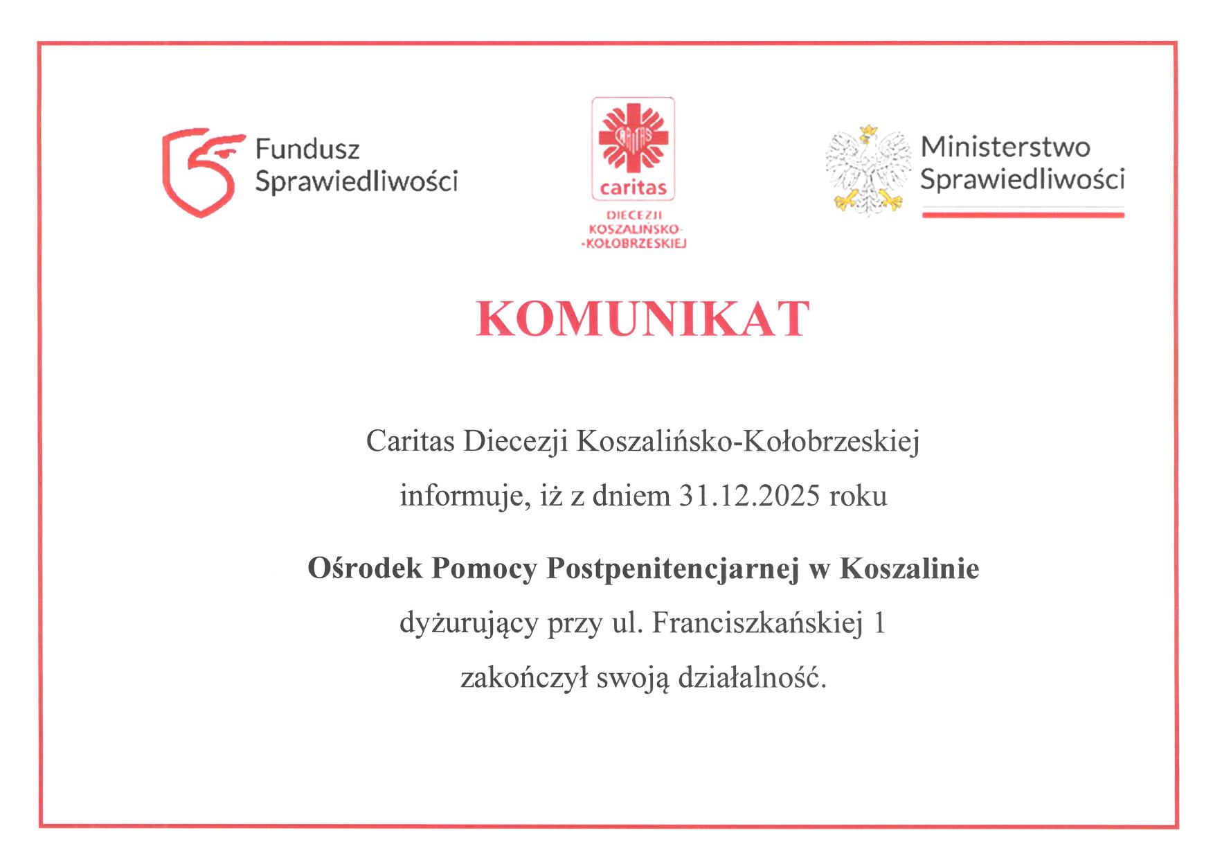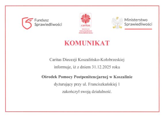 Od 07.01.2026 r. Caritas Diecezji Koszalińsko-Kołobrzeskiej świadczy pomoc osobom pokrzywdzonym przestępstwem, świadkom oraz osobom im najbliższym w ograniczonym zakresie ze względu na wygaśnięcie umowy z Ministerstwem Sprawiedliwości, obowiązującej do 31.12.2025 r. Do dyspozycji Beneficjentów pozostaje Okręgowy Ośrodek Pomocy Pokrzywdzonym Przestępstwem w Koszalinie oraz 4 Punkty Lokalne. W styczniu 2026 r. […]