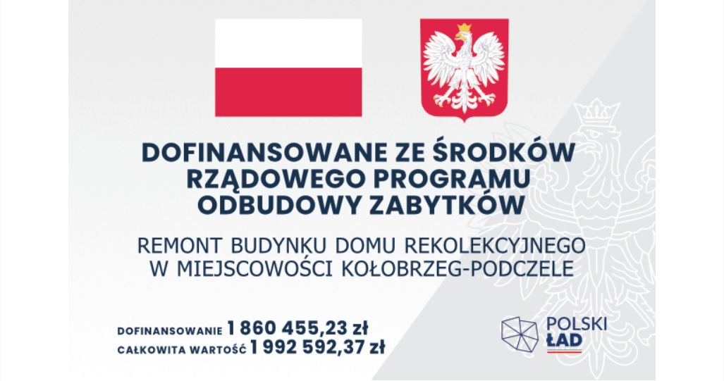 Caritas Diecezji Koszalińsko-Kołobrzeskiej realizuje zadanie polegające na wykonaniu robót budowlanych wewnątrz budynku Domu Rekolekcyjnego w miejscowości Kołobrzeg-Podczele w ramach inwestycji pn. Remont budynku Domu Rekolekcyjnego w miejscowości Kołobrzeg – Podczele, dofinansowanej z Rządowego Programu Odbudowy Zabytków. Data podpisania umowy o dofinansowanie: 12.03.2024 r. Wartość inwestycji: 1 992 592,37 PLN Wartość dofinansowania: […]