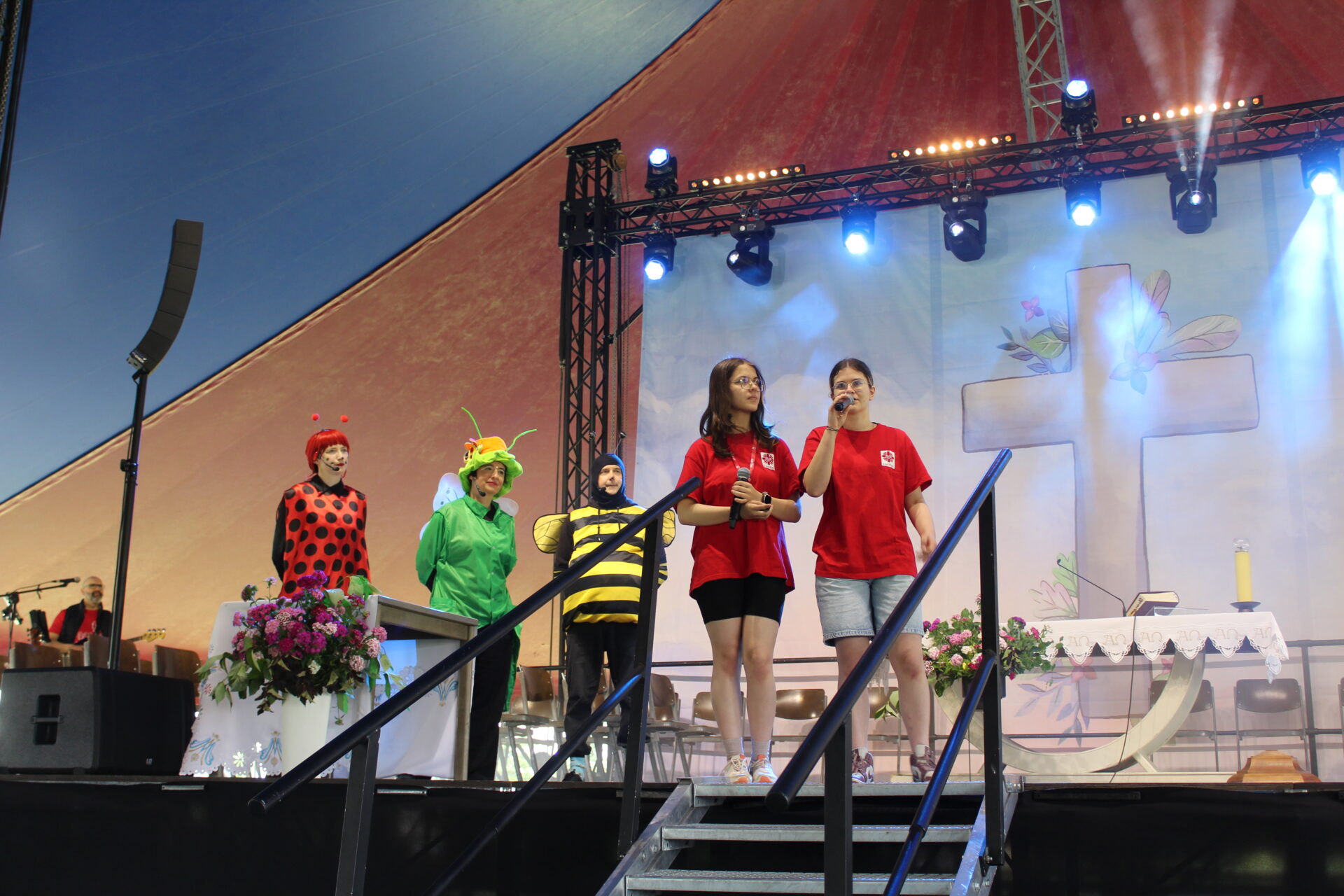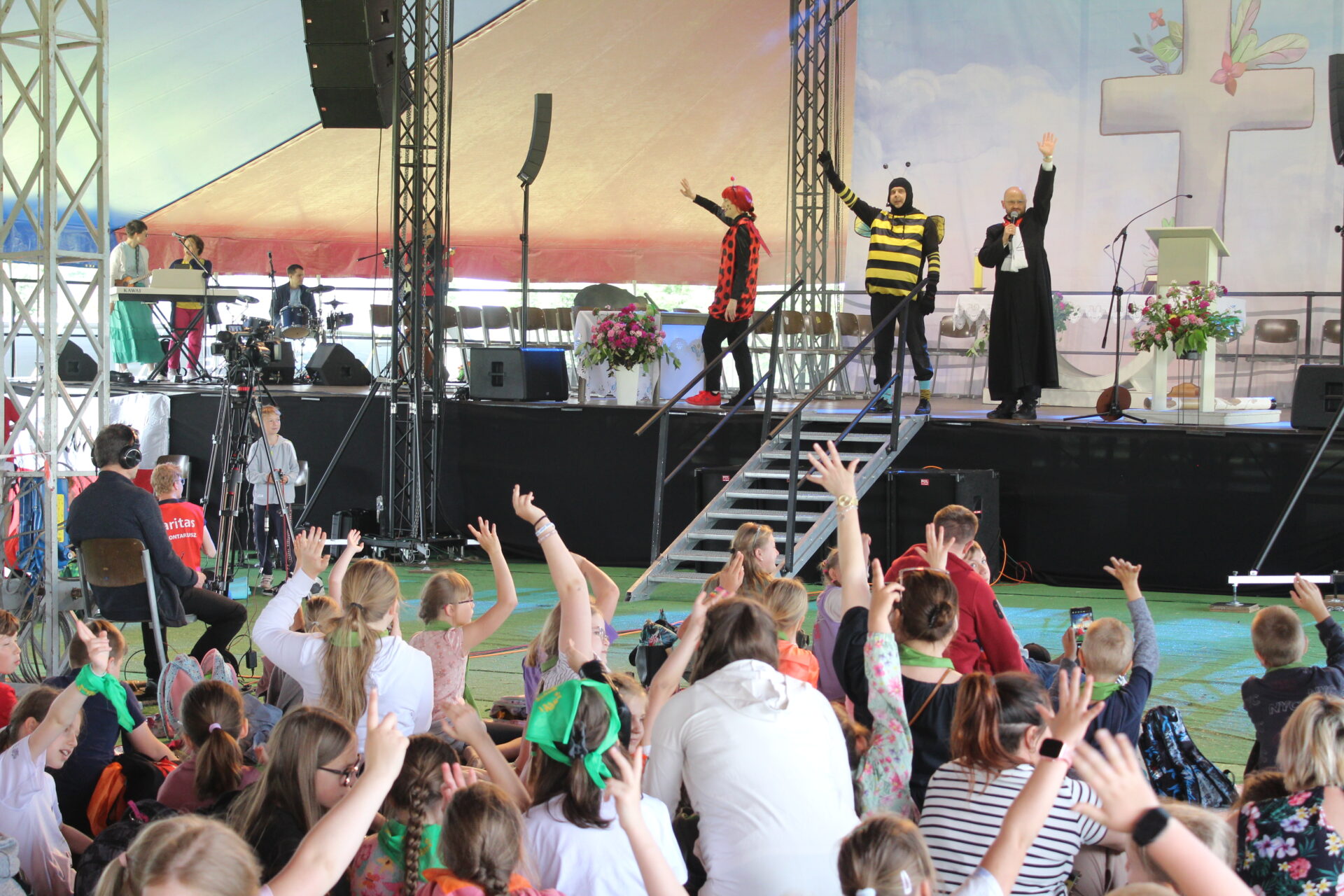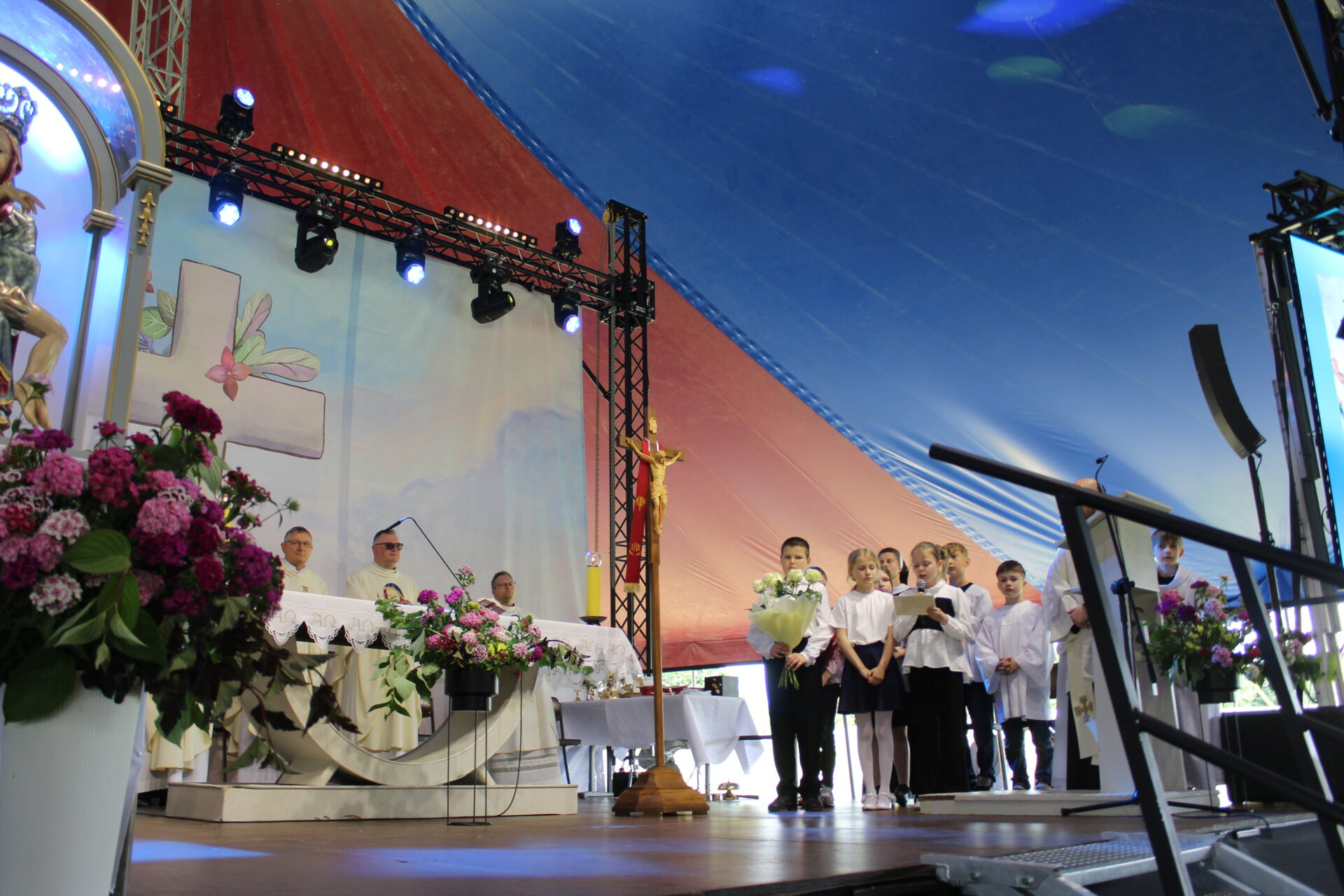 Przed Mszą św. dzieci, w tym przedstawiciele SKC, uczestniczyły także w oryginalnej katechezie przygotowanej przez wspólnotę Koinonia Jan Chrzciciel z Błotnicy, która połączyła elementy teatru, śpiewu i wspólnego tańca, przekazując Ewangelię w radosnej, zrozumiałej dla najmłodszych formie.